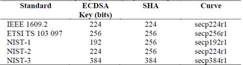 The elliptical curve selected and the kind of processor incorporated into the vehicles influences on the processing time to exchange information quickly and safely between them. Table 1 lists the size of the ECDSA key, Secure Hash Algorithm (SHA) and curve recommended for signing and checking messages in compliance with the standards IEEE 1609[1], ETSI [25], and the guidelines of the National Institute of Standards and Technology (NIST) [26].
