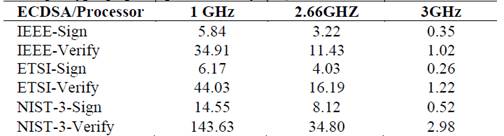 The processing time (in ms) for signing and checking messages was measured in a computer with 2.66 GHz Intel Core 2 Quad processor, using ECC [4]. The research in [27] also measured the processing time using computers with Intel architectures Intel, of 1GHz and 3GHz, Table 2 compares the results; the experiments with a 3GHz processor obtained the lowest processing time. For instance, if we selected the standard ETSI which employs the secp256r1 elliptic curve, keys of 256 bits and SHA-256, the processing time to sign a message is 0.26 ms, and the processing time to check the message is 1.22 ms.