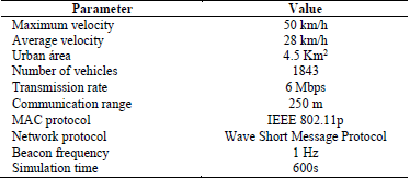 Table 3 shows the main parameters of mobility and the network used in the simulations. We performed simulations for 600s and executed five runs for each experiment. At 600s, 1843 vehicles entered the scenario.
