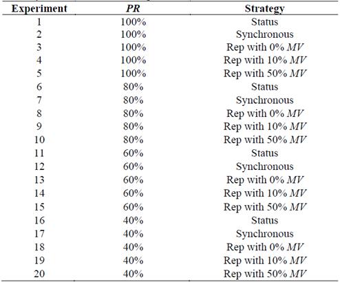A total number of 20 experiments were carried out and the PR ranged from 40% to 100% during the strategy of pseudonym changing. Three cases conducted for the proposed strategy were: 50%, 10% and 0% of MV. Table 4 shows the planned experiments.