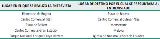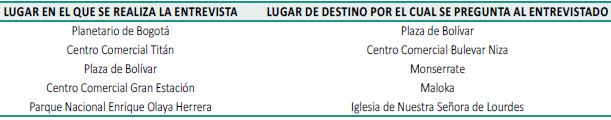 Los participantes fueron entrevistados en cinco sitios de la ciudad de Bogotá (15 personas en cada lugar), a quienes se les indagó acerca de cómo se podría llegar desde cada uno de estos, a un lugar de destino. Los lugares para realizar las entrevistas se seleccionaron por considerarse referentes o hitos que hacen parte de la cultura urbana de los bogotanos a los que concurren gran cantidad de personas, y con los cuales se logró abarcar distintos puntos geográficos de esta ciudad. La información fue recogida en los lugares que se mencionan en la Tabla 1.
