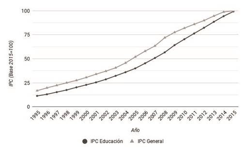 Aunque el IPC de educación abarca todos los niveles, el nivel universitario es el que más ha aportado en su aumento (INEC, 2017). El IPC en educación supera también el de alimentos y bebidas no alcohólicas, prendas de vestir y calzado, alquiler y servicios de la vivienda, muebles, artículos para la vivienda y servicio doméstico, salud, transporte, comunicaciones, entretenimiento y cultura, comidas fuera del hogar y servicio de alojamiento, energía, servicios menos vivienda, vivienda, alquiler de vivienda, electricidad, gas y otros combustibles relacionados con la vivienda y bienes y servicios (INEC, 2017).