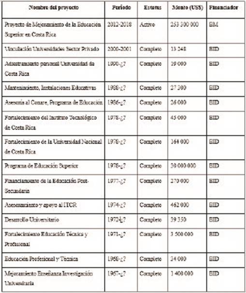El BID posee un largo historial de préstamos para educación superior en Costa Rica. De hecho, este apoyó la construcción de edificaciones, la regionalización de la educación universitaria y la creación de la UNA, el Instituto Tecnológico de Costa Rica (ITCR) y la Universidad Estatal a Distancia (UNED) (BID, 2017).