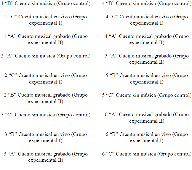 En el presente estudio utilizamos un diseño cuasi-experimental A - B - A, con una evaluación inicial (A), la aplicación de un programa integrado por cuentos (B), con 3 variantes (sin música, con música en vivo y con música grabada).