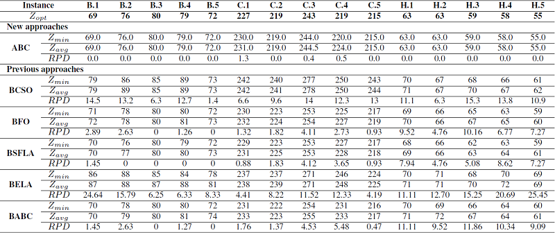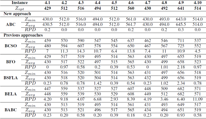The table V show the results obtained for instances from group 4, where ABC had the best optimal values compared to the results by the previous approaches, only BFO exhibit a good performance for this data with two global optimums.