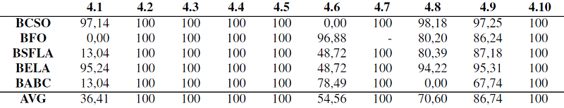 In the group 5, ABC, BFO, BSFLA AND BABC obtained optimal values, detailed as follows: ABC, four optimal values; BFO, three optimal values; BSFLA, four optimal values; BABC, two optimal values. BELA and BCSO did not achieve some optimum. The results are shown in the Table VI.