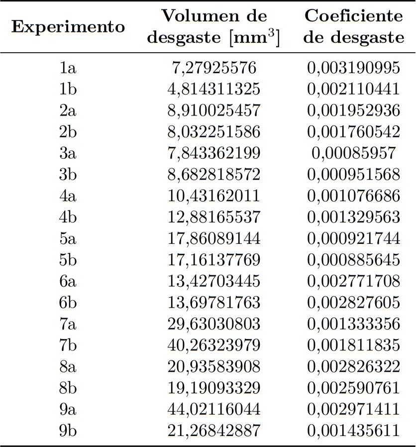 De la Tabla 2 se observa que los valores para el volumen de desgaste resultaron en un intervalo 4,8143 a 44,0212 mm3 y los valores del coeficiente de desgaste en el intervalo desde 0,000860 hasta 0,003191.