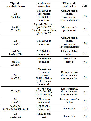 En la Tabla 2 se observa un resumen de las técnicas utilizadas y los ambientes en los cuales generalmente son evaluados los diferentes recubrimientos base zinc.