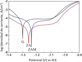 Asimismo, Yao et al. [10] evaluaron el comportamiento a la corrosión comparativamente de tres tipos de recubrimientos de zinc con diferentes combinaciones de Zn, Al, Mg y Cu (Zn-0,1 Cu (G), Zn-5Al-0,1Cu (ZA) y Zn-5Al-1Mg-0,1Cu (ZAM)). Realizaron pruebas de cámara de niebla salina y electroquímicos en una solución acuosa de 5 y 3,5 % de NaCl, respectivamente, para acceder al comportamiento de corrosión de los recubrimientos.
