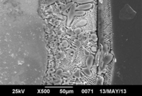 En la Figura2 se observa este último efecto, donde Rico y Hernández [6] estudiaron la influencia de la velocidad de enfriamiento en la morfología y distribución de las fases de los recubrimientos Zn-7Al sobre acero. La microestructura del recubrimiento enfriado en agua muestra la mezcla eutéctica segregada en la intercara recubrimiento/acero, y los enfriados dentro del horno, presentan un microconstituyente monotectoide de morfología dendrítica.