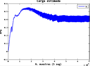 Durante el mismo periodo de tiempo en la Figura 24. Se muestra el seguimiento de la corriente iq al arranque del motor, estableciéndose en 0.5 amperes; esta es la corriente activa que es aprovechada por el motor y es transformada en par mecánico. De igual manera, en la Figura 25 se muestra la regulación de la corriente id, esta debe mantenerse en 0 amperes dado que es la corriente reactiva que no es posible aprovecharla. Ambas corrientes mostradas por igual muestran rizo el cual se debe a la resolución de los sensores de corriente empleados. Finalmente, en la Figura 26 se muestra la estimación del par de carga en el eje del motor durante el mismo periodo de tiempo, la cual al llegar a la velocidad deseada se establece en 0.4 Nm.