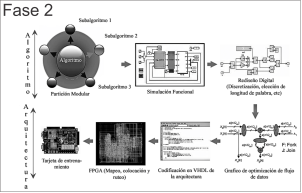 5. Codificación HDL: A partir del gráfico de flujo de datos de la etapa anterior se transcribe a código VHDL; las transferencias de datos por lo regular son controladas por máquinas de estados finitos síncronas a la señal de reloj del FPGA.