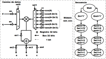Para el desarrollo de este módulo se realiza la arquitectura mostrada en la Figura 16, la cual es de ayuda para la solución en línea de la Ecuación (27) y la optimización de recursos. En el caso de este módulo se utiliza un multiplicador, un sumador y un registro, todos estos elementos se encuentran dentro del FPGA, sin embargo, al ser limitados se debe de optimizar su uso. Como se observa en la Figura 16, este requiere 8 entradas: d, q y las 6 funciones trigonométricas. A la salida tenemos los valores a, b y c, los cuales representan el valor del voltaje de las fases. Posteriormente en la Figura 17 se muestra la implementación en el hardware de las ecuaciones (27), esta metodología fue tomada de [19]. Dado la complejidad del sistema para ejemplificar el desarrollo, solo se muestra este módulo, sin embargo, la construcción de los demás módulos del sistema se realiza de manera similar. En la Tabla 1 se muestra el consumo de recursos lógicos en el FPGA después de realizar la implementación de todos los módulos implicados en el diseño y en la Figura 18 se presenta el diagrama de más alta jerarquía del sistema.