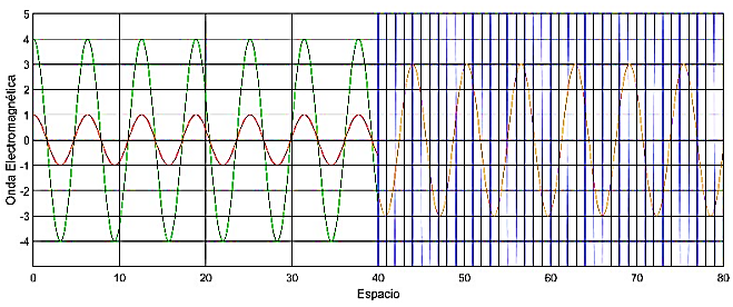 La energía perdida al momento de la propagación sobre el material, recibe ese nombre porque no se almacena en el material formando enlaces polares, parte de esta energía se refleja del material y parte de ella atraviesa el material, de acuerdo con el valor de conductividad de este. Esto se aprecia en la Figura 3. Se observa un campo eléctrico incidente de verde que al chocar en el medio (de rayas azules) se refleja parte del campo (de rojo) y parte se propaga por el campo (de naranja). Todo esto queda cuantificado en la permitividad compleja. En todo este análisis se asume que el material es isotrópico, es decir, que los momentos dipolares o que los enlaces polares se dan en la dirección del campo eléctrico, en materiales anisotrópicos esto no ocurre, pero este análisis no se toma en cuenta para esta investigación ya que hemos considerado a los ADC isotrópicos.