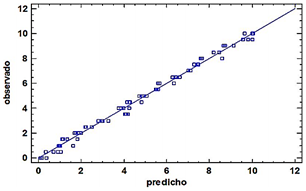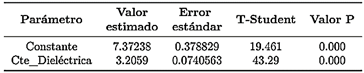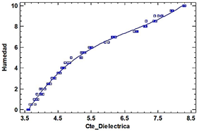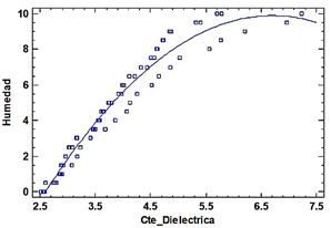(31)En este modelo el efecto lineal del coeficiente dieléctrico con respecto al valor de humedad esperado resulta significativo. En la tabla siguiente se muestran los resultados del contraste de hipótesis donde el «valor P» del efecto lineal es menor a 0.05. Se tiene un modelo de regresión lineal de R2 = 95.8057 % y un error estándar de 0.382134.