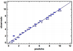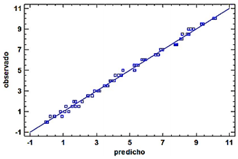 Se tiene un modelo de regresión lineal de R2 = 97.1325% y un error estándar de 0.297068. La Figura 10 muestra la relación entre la constante dieléctrica y la humedad, mientras que en la Figura 11 se observa la relación del valor predicho y el real de la humedad.