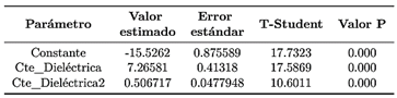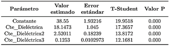 (32)Donde el efecto lineal y cuadrático del coeficiente dieléctrico con respecto al valor de humedad resultaron significativos. En la Tabla 3 observamos que el «valor P» de los efectos es menor a 0.05.