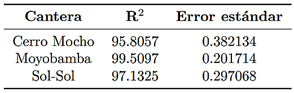 Con los valores de CD vs. CH obtenidos para cada cantera se ajusta la curva de calibración mediante modelos de regresión lineal. En este ajuste el CH se establece como variable dependiente y la CD como variable independiente con diferentes efectos: lineal, cuadrática, cúbica y de cuarto grado. Para la selección del modelo de regresión lineal se aplicó el método Stepwise Forward para encontrar cuál de los efectos de la CD se ajusta mejor con el CH. Este método clásico para la selección de variables inicia con un modelo vacío y en cada iteración evalúa incorporar algunos de los efectos definidos: lineal, cuadrático, cúbico y de cuarto grado de la constante dieléctrica. Se decide incorporar algunos de los efectos mencionados si cumple el nivel de significancia definido: Valor P menor a 0,05. El método Stepwise Forward finaliza cuando no se puede incorporar más efectos por no cumplir el nivel de significancia. Para evaluar el nivel de significancia de los efectos se realiza una prueba de hipótesis con T-Student. En esta prueba se verifica si el coeficiente estimado del efecto es igual o diferente de cero.