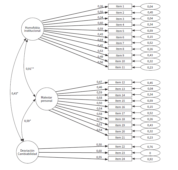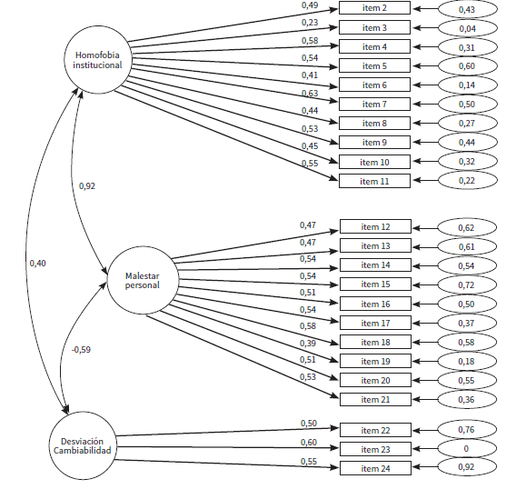El modelo de tres factores propuesto en el AFC (modelo 1) a partir de la solución factorial propuesta en Raja y Stokes (1998) y su adaptación al español por Rodríguez-Castro et al. (2013) de la escala de MHS-L presenta buenos índices de ajuste (α2 = 124,886, =1,00, g.l = 248, un CFI = 1,00, TLI = 1,00, RMSEA = 0,00). En la figura 1, podemos encontrar el modelo estandarizado. Tal y como se puede observar, el ítem 1 (“Los empresarios deberían proporcionar un seguro médico para las parejas de sus empleadas lesbianas”) y el 3 (“Las lesbianas que adoptan niños/as no deberían ser más controladas que los padres y madres heterosexuales”) tienen cargas factoriales inferiores a 0,3, además estos ítems explican menos de un 5% de la varianza del factor.
