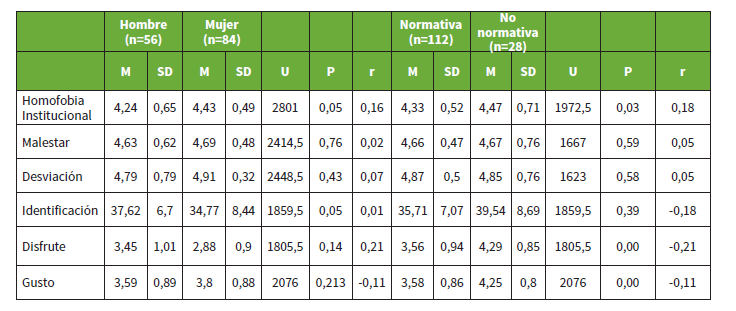 En la tabla 2 pueden encontrarse el test U de Mann-Whitney para género y para orientación sexual.