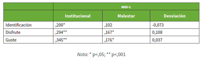 Correlaciones entre MHS-L, identificación, disfrute y gusto