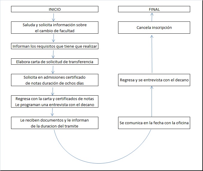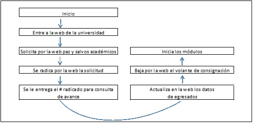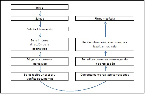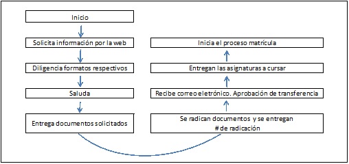 Otro aspecto a tener en cuenta son los excesivos trámites que tenían que realizar los estudiantes para obtener la respuesta requerida, especialmente en el proceso de trasferencias externas, donde el tiempo de respuesta se prolonga hasta un mes y como si fuera poco los tramites en su mayoría se realizaban de manera manual y operativa, propiciando a que los estudiantes tuvieran que trasladarse en varias ocasiones a la oficina para su seguimiento. En el proceso de módulos se detecta que hay ausencia de seguimiento por parte de la dirección encargada de los estudiantes que van a iniciar este proceso, también se observó que para la obtención de paz y salvo de las diferentes dependencias el estudiante realizaba muchos desplazamientos teniendo en cuenta que las oficinas están ubicadas en diferentes sedes. Al igual que en los anteriores procesos, se observó la poca utilización de los sistemas de información para agilizarlos. Como producto del levantamiento de los ciclos de servicio y teniendo en cuenta los momentos críticos en el servicio, se propuso el diseño de ciclos simplificados fundamentados en los sistemas tecnológicos y de información. Ver figuras 1, 2, 3, y 4.