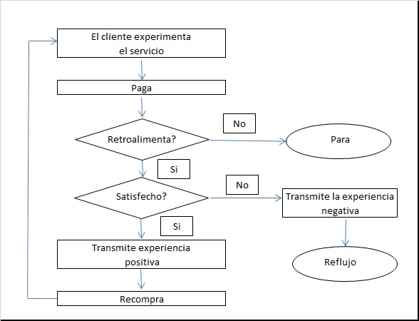 Un año después Mendoza (2010) expone claramente la relación cliente- servidor la cual juega un papel decisivo en la prestación del servicio; se trata de un proceso interactivo, de reacciones mutuas, donde incluso hay algo más que comunicación enfatizando la incidencia de los comportamientos de cada uno sobre el otro. Es así como su teoría sugiere concentrarse en el comportamiento del cliente. A continuación se presentará un flujo grama que representa la conducta del cliente y el ciclo de servicio. (Figura 6). Este gráfico muestra tres fases de la conducta del cliente: compra, retroalimentación y comunicación con los demás clientes. El contacto de compra es realmente la experiencia del servicio que se expresa legalmente en un contrato, donde la empresa se compromete a prestar el servicio y el cliente lo experimenta y compensa a la empresa por el mismo mediante el pago (precio).