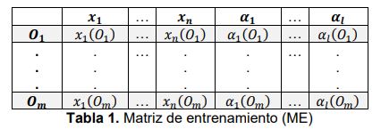 Sea 𝑀𝑝 el conjunto de valores admisibles de la variable 𝑥𝑝, 𝑝 = 1, … , 𝑛, es decir: 𝑥𝑝 (𝑂𝑖 ) ∈ 𝑀𝑝 𝑖 = 1, … , 𝑚. (1) Para cada objeto 𝑂𝑖 de 𝑈 hay una 𝑙-upla de pertenencia: 𝛼(𝑂𝑖 ) = (𝛼1(𝑂𝑖 ), … , 𝛼𝑙(𝑂𝑖)) donde 𝛼𝑗 (𝑂𝑖 ) ∈ {0,1}, (2) El valor 1 indica que el objeto pertenece a la clase, 0 que no pertenece. Kj, 𝑗 = 1, … , 𝑙. Esta información se almacena en una estructura denominada matriz de entrenamiento (ME). En la Tabla 1, se muestra la estructura del contenido de la matriz de entrenamiento, donde 𝑥𝑖(𝑂𝑗) representa el valor de la variable 𝑥𝑖 en el objeto 𝑂𝑗 .