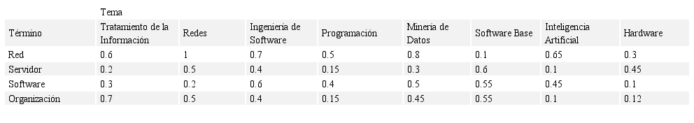Los resultados sobre las pruebas de clasificación que se presentan en este trabajo fueron seleccionados tomando los conjuntos de apoyo 𝛺2, 𝛺6 y 𝛺9 , los cuales aportan una mayor cantidad de información. Con base en los temas definidos para la clasificación y los términos más frecuentemente utilizados en esa área, se determinó la relación semántica entre los términos y cada tema, los cuales forman la matriz de asociación semántica. En la Tabla 2, se muestran ejemplos de las asociaciones semánticas obtenidas.