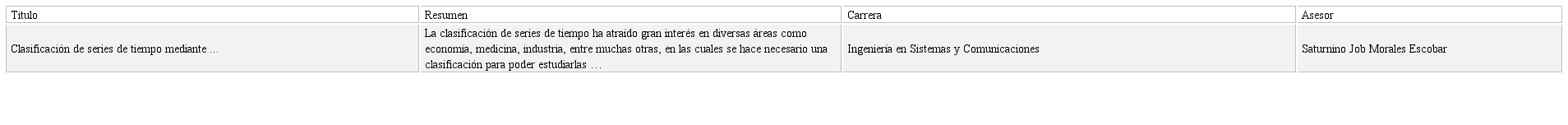 De manera análoga, se determinó una matriz de la semejanza semántica para los valores de los rasgos carrera y asesor. En la Tabla 3, se muestra un ejemplo de las descripciones de los documentos en términos de los rasgos almacenados en la matriz de entrenamiento.