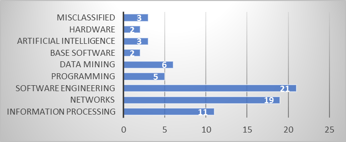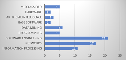 Como se puede observar de las descripciones, todos los rasgos son de tipo textual y los conjuntos de los valores admisibles para cada rasgo están determinados como un conjunto de rasgos textuales. En este caso, como primera aproximación, se consideró que cada documento fuera clasificado solamente en un tema, sin embargo, se puede eliminar esta restricción. La matriz de entrenamiento 𝑀𝐸 = {𝑑1, 𝑑2, … , 𝑑𝑛}, se conformó con 94 trabajos de carrera afines, los restantes 72 se utilizaron para la matriz de control, que como se mencionó, será utilizada para evaluar la calidad de la clasificación de los documentos.