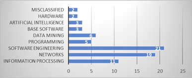 Con base en lo presentado en la sección previa, para la aplicación de la propuesta de clasificación de textos se utilizó como caso de estudio un conjunto de trabajos escritos para titulación clasificados por tema. Así, el universo fue un conjunto con 166 trabajos de titulación clasificados en las siguientes áreas: tratamiento de la información, redes, ingeniería de software, programación, minería de datos, software de base, inteligencia artificial y hardware. Estos trabajos de titulación han sido realizados por alumnos egresados del Centro Universitario UAEM Valle de México de la Universidad Autónoma del Estado de México, México. Los documentos están descritos en términos del conjunto de rasgos 𝑅 = {𝑡𝑖𝑡𝑢𝑙𝑜, 𝑟𝑒𝑠𝑢𝑚𝑒𝑛, 𝑎𝑠𝑒𝑠𝑜𝑟, 𝑐𝑎𝑟𝑟𝑒𝑟𝑎}. Así, la descripción de cada documento será determinada por el título del trabajo, el resumen, el asesor y la carrera cursada por el estudiante. De esta manera, la descripción de un documento será una fila de la matriz de entrenamiento o de la matriz de control, la cual tiene la misma estructura que la matriz de entrenamiento y es utilizada para evaluar la eficiencia del algoritmo de clasificación.