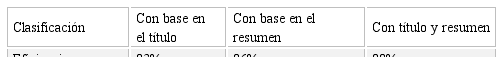 De los resultados mostrados en las tablas anteriores, cuando se utilizó solamente el título, la eficiencia de la clasificación fue del 95%, al agregar el resumen subió al 96% y al utilizar ambos rasgos se logró el 98%, lo que representa una buena calificación para el clasificador.