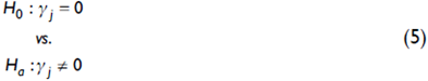 De manera análoga, se tienen los sistemas de hipótesis asociados a los efectos de los γj sobre la dispersión, da dos por la siguiente expresión (véase ecuación 5).
