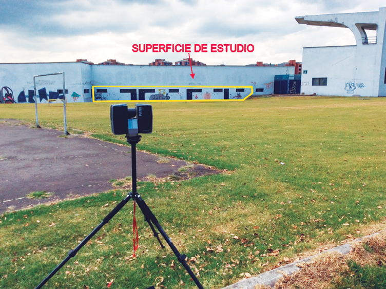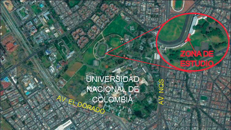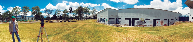 Se plantea el desarrollo de un escenario, donde se pueda escanear una superficie en un rango de distancia visible de 0 m a 120 m, teniendo en cuenta las especificaciones técnicas del TLS Faro Focus 3D, para lo cual se definió una locación que cumplía con dicha condición dentro del campus de la Universidad Nacional de Colombia, en un costado del Estadio Alfonso López (foto 1).