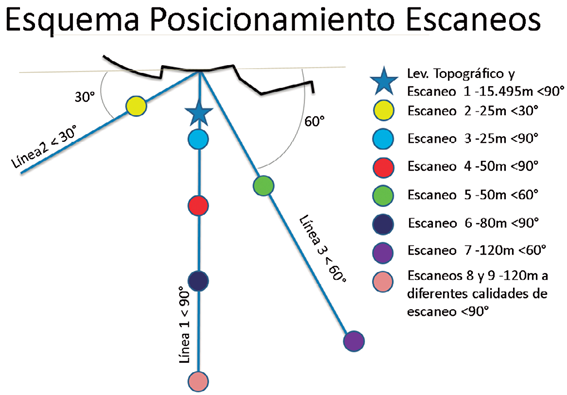 Este se realiza según lo presentado en la figura 1, donde a partir del diagrama de diseño se muestra la localización de cada uno de los puntos, donde se hará el levantamiento con el escáner terrestre. Puntos colocados sobre los tres alineamientos definidos (en ángulos de 30°, 60° y 90° con respecto a la superficie de escaneo). La localización precisa de dichos puntos en el terreno se realiza por medio de métodos de topografía convencional, con estación topográfica total (foto 3).