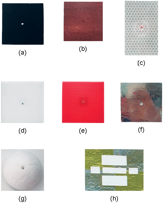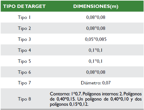 Para la identificación de objetos dentro de los escaneos fue necesario diseñar una serie de targets u objetivos de reconocimiento para los escaneos (figura 2), los cuales fueron pensados para que se distinguieran en diversos colores, materiales, tamaños (véase tabla 1) y formas, que además fueran de fácil elaboración, accesibilidad a sus materias primas y representativos en los entornos naturales del espacio físico que tradicionalmente se documenta por medio del escáner terrestre.