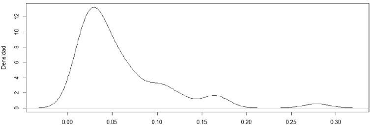 De las estadísticas descriptivas del error medio, puede decirse que la variable respuesta es sesgada a la derecha (la media es mayor que la mediana). Para verificar este hecho e identificar la intensidad de dicho sesgo, se ilustra la densidad de la dicha variable respuesta (figura 3).