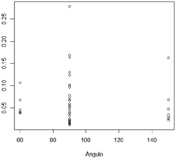 De los gráficos que se ilustran en las figuras 4 y 5, puede decirse que la dispersión no es constante entre las observaciones. Nótese que el error medio toma valores entre 0 y 0,15 aproximadamente, para todas las distancias medidas excepto para los 80 m donde se observa un posible dato atípico con un valor superior a 0,25 y una concentración de los puntos de cerca de 0 y 0,05. De manera análoga, en el gráfico de dispersión de los ángulos se nota la presencia de un posible valor atípico para los ángulos de 90° y 150°, y de nuevo (Ge, 2017) la dispersión de los puntos parece no ser homogénea entre ángulos. Por último, del box-plot en la figura 6, se observa que las cajas poseen anchos diferentes, lo cual indica que no existe la misma dispersión de las observaciones entre targets. Con base en lo anterior, se concluye que no es adecuado asumir una dispersión constante; por tal motivo, se decide ajustar un modelo lineal generalizado doble.