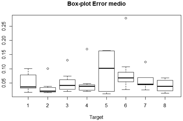 Teniendo en cuenta la variable respuesta introducida en el modelo como la media de las distancias euclidianas entre las coordenadas observadas y las teóricas, se pudo establecer que el tipo de target que arroja mejor exactitud es el tipo 2 que corresponde con madera tipo cedro y, por el contrario, el que más error presenta es el tipo 6, hecho de papel brillante.