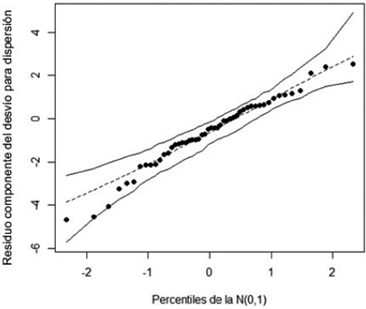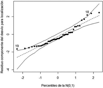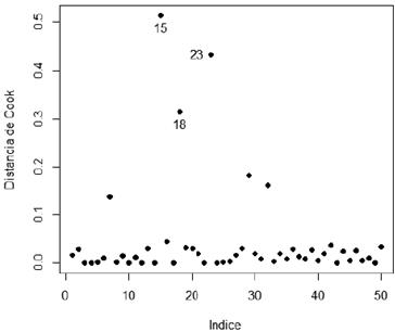 Para la validación del modelo se emplean los gráficos de bandas de 99% confianza y el criterio de la distancia de Cook para la identificación de observaciones potencialmente influyentes. Al observar las figuras 7 y 8 que ilustran las bandas de confianza, se encuentra que existen dos puntos fuera de estas (observaciones 19 y 18) para el modelo asociado a la media; sin embargo, esta distancia no es considerable y puede explicarse por la variación aleatoria de los datos. Por otro lado, para el modelo asociado a la dispersión se observa que no existe punto alguno fuera de las bandas, a partir de esto se concluye que el modelo se ajusta de forma adecuada. En los gráficos asociados a la distancia de Cook que se ilustran en las figuras 9 y 10, se tiene de nuevo que la observación 18 presenta valores posiblemente atípicos y en este caso especial potencialmente influyentes; a esto se le suma que las observaciones 15 y 23 también se postulan como potencialmente influyentes; sin embargo, al extraer estas observaciones y realizar el ajuste del modelo no se generan cambios estadísticamente significativos en el efecto de la distancia sobre el error medio esperado.