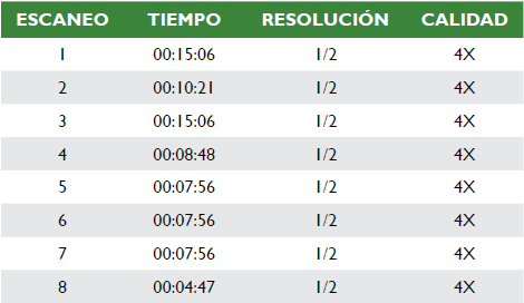 Para la captura de datos por medio del TLS Faro Focus 3D, enmarcado en el diseño del experimento planteado, se procede con la ubicación del equipo, en cada uno de los puntos y desde allí hacer el levantamiento con los siguientes parámetros de configuración por escaneo.