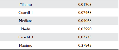 A partir de lo anterior se comenzó con la implementación del modelo en el software estadístico R, para lo cual se inició con la premisa de considerar que el error es una variable cuyo dominio son los reales positivos. Por lo que se propone un modelo de la familia de distribuciones Gamma para explicar el comportamiento de esta variable (Forstner & Khoshelham, 2017). Para verificar si la familia de distribuciones Gamma es adecuada para el ajuste del modelo, se emplean las estadísticas descriptivas (véase tabla 3).