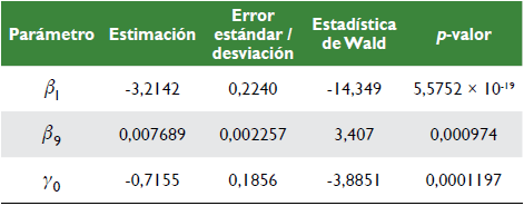 corresponden a las estimaciones de ßj y su error estándar asociado σj, esto para j = 2,...,10. El estadístico de Wald está asociado al sistema de hipótesis (véase ecuación 4).
