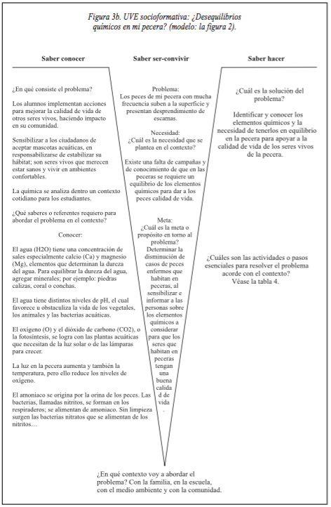 1. Énfasis en problemas contextuales y de la vida. La UVE socioformativa se enfoca en solucionar un problema del contexto planeando y argumentando la solución con el saber académico, las experiencias y se trasciende de las preguntas de asignatura y de la asignatura misma, mientras que la UVE de Gowin se aplica generalmente para problemas o preguntas académicas enfocadas a los contenidos de las asignaturas, “preguntas en el marco de conjuntos de conceptos organizados en principios (que nos explican cómo se comportan los objetos y fenómenos) y teorías” (Herrera y Sánchez, 2012, p. 107), para la evaluación a profundidad de los argumentos matemáticos (Afamasaga-Fuata’i, 2004; Polat y Doğan, 2015; Yılmaz y Kacar, 2016), para mejorar la comprensión de la asignatura de química (Polancos, 2011;Castro et al., 2015) o de física (Gil et al., 2013), para orientar las investigaciones (Moreira y Novak, 1988) e incluso se forma a los docentes en el uso de la UVE de Gowin (Pozueta et al., 2012; Meric, 2014).