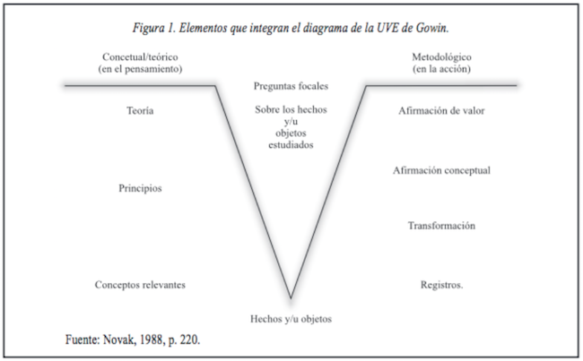 La UVE forma parte de organizadores de la información, como mapas mentales y diagramas. En su momento, Novak y Gowin (1984) aseveraron que con la UVE se construye el conocimiento. De igual manera, Guardián y Ballester (2011) comparten que la UVE de Gowin promueve la curiosidad de los estudiantes, les conduce a relacionar hechos naturales o artificiales con sus ideas, a solucionar problemas de asignaturas, a documentar y verificar la información y a comunicar los resultados. “El punto central de la UVE es seleccionar un evento o un objeto del entorno, observarlo detenidamente y registrarlo. La selección y la interpretación de los eventos se ve influenciada por los conceptos previamente adquiridos” (Novak y Gowin, 1984, p. 5).