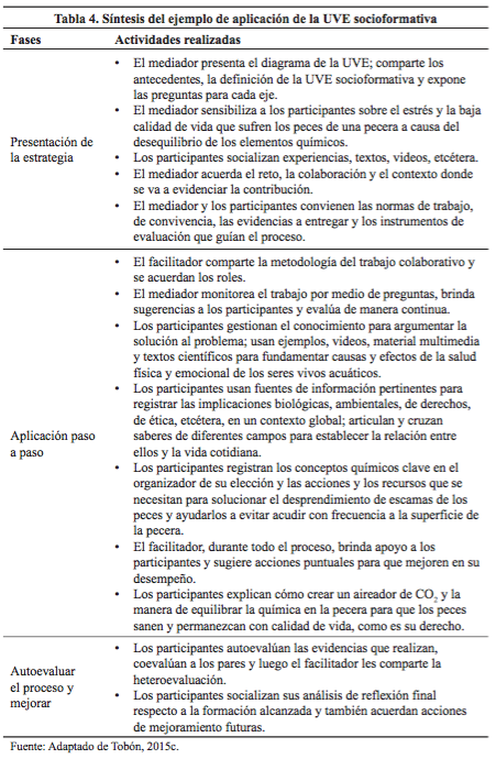 5. Trabajo colaborativo. Diferentes estudios muestran que la UVE de Gowin no aborda la colaboración de manera explícita (Guardián et al., 2010; Crippen y Archambault, 2012; Maneru, 2012). La UVE de Gowin se empleó para evaluarse entre pares, pero para mejorar las tareas de estudio (Ching-Chung, et al., 2001), mientras que en la UVE socioformativa se aborda la colaboración por la necesidad de alcanzar la solución; la coevaluación integral y el apoyo entre pares forma parte de la metodología (Tobón, 2013a).