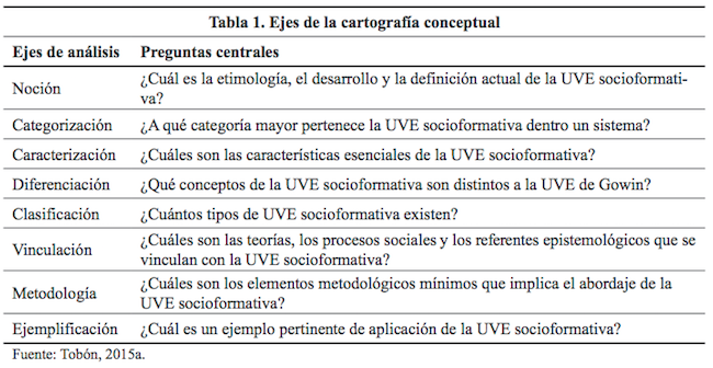 Realización de la cartografía conceptual, propuesta por Tobón, y que consta de ocho categorías o ejes (Tobón, 2004, 2015a). Los análisis con la cartografía facilitan y orientan el abordaje de un concepto, teoría o metodología a profundidad mediante la sistematización y aplicación con sentido de la información. La cartografía conceptual registra los conocimientos de un tema, añade los faltantes de la información y promueve nuevas investigaciones a partir de la información existente (ver tabla 1).