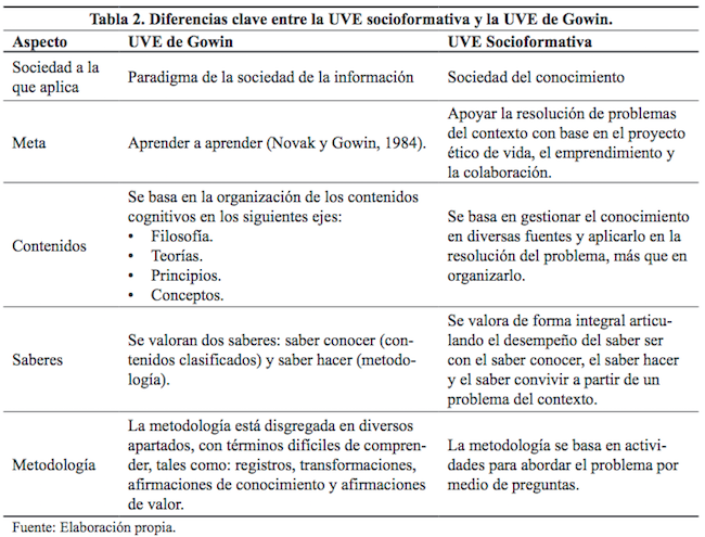 La UVE de Gowin se promueve para el aprendizaje de contenidos y para acentuar que los estudiantes se apropian de la estructura del conocimiento (Novak, 1990; Dillon y Åhlberg, 2006). En la mayoría de los estudios, la UVE se usa para acentuar los beneficios del dominio conceptual, en tanto que la UVE socioformativa se enfoca en planear en forma colaborativa las acciones, las estrategias, los recursos y las personas que participan en la solución a los problemas de contexto, e incluso la implementación y la evaluación. Con un solo vistazo a la UVE socioformativa, las personas pueden hacer análisis sobre la viabilidad de la planificación y de la solución al problema de contexto; es un mapa que indica a las personas qué han logrado y cuánto les representa terminar o realizar los ajustes usando experiencias y argumentos académicos.