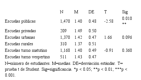 Con la finalidad de conocer si había diferencias significativas en cuanto a las condiciones contextuales de la escuela y la cibervictimización, se utilizó la prueba t de Student. Se corroboró que existen diferencias significativas entre las escuelas públicas y privadas, sobresaliendo el fenómeno de cibervictimización en los centros privados. Por el contrario, no se aprecian diferencias significativas entre escuelas urbanas y rurales, así como entre el turno matutino y vespertino (ver tabla 1).